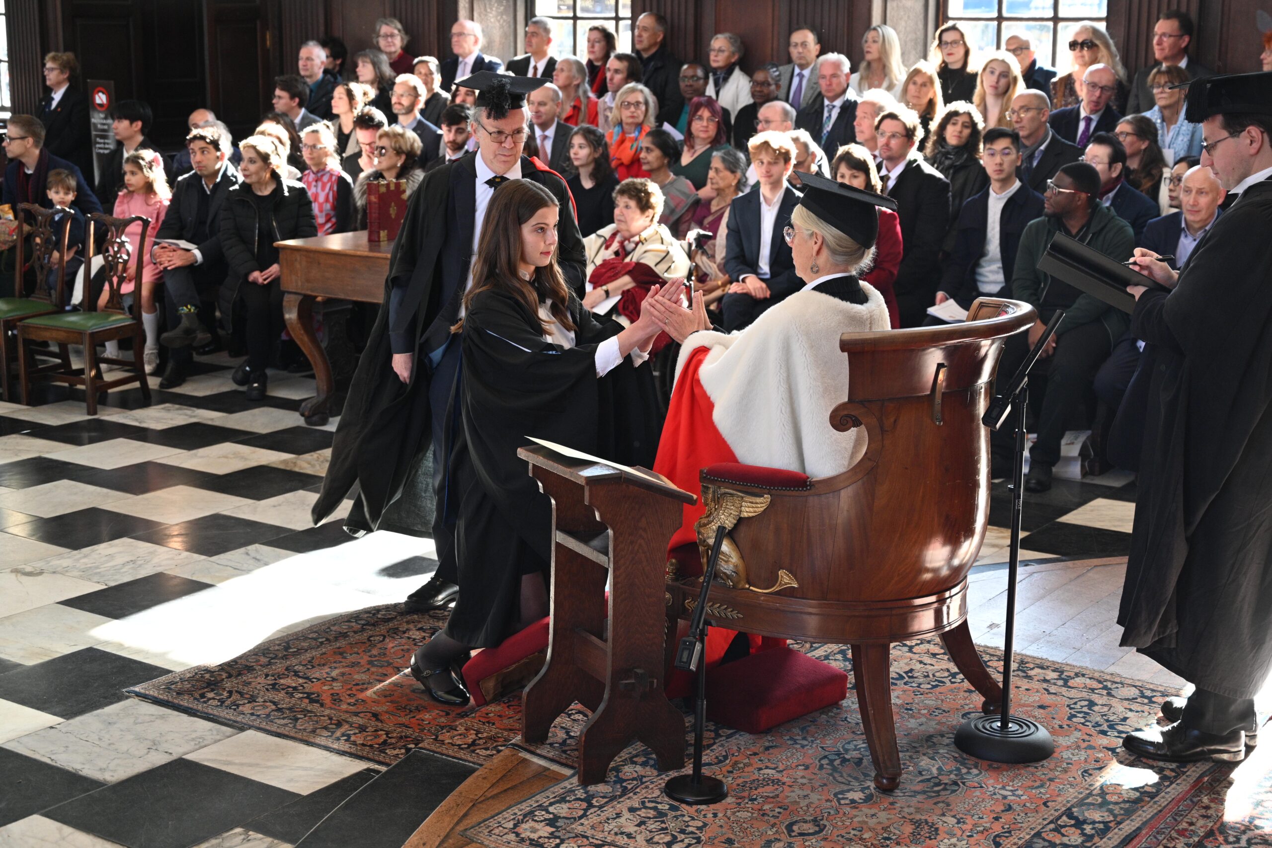 The procession stepped onto the street and crossed the arched bridge over the River Cam, where slow, punting boats drifted beneath us with passengers wrapped in blankets against the crisp October air. Then they moved on toward Senate House, where the ceremony unfolded almost entirely in Latin – regal and reverent in every way.
