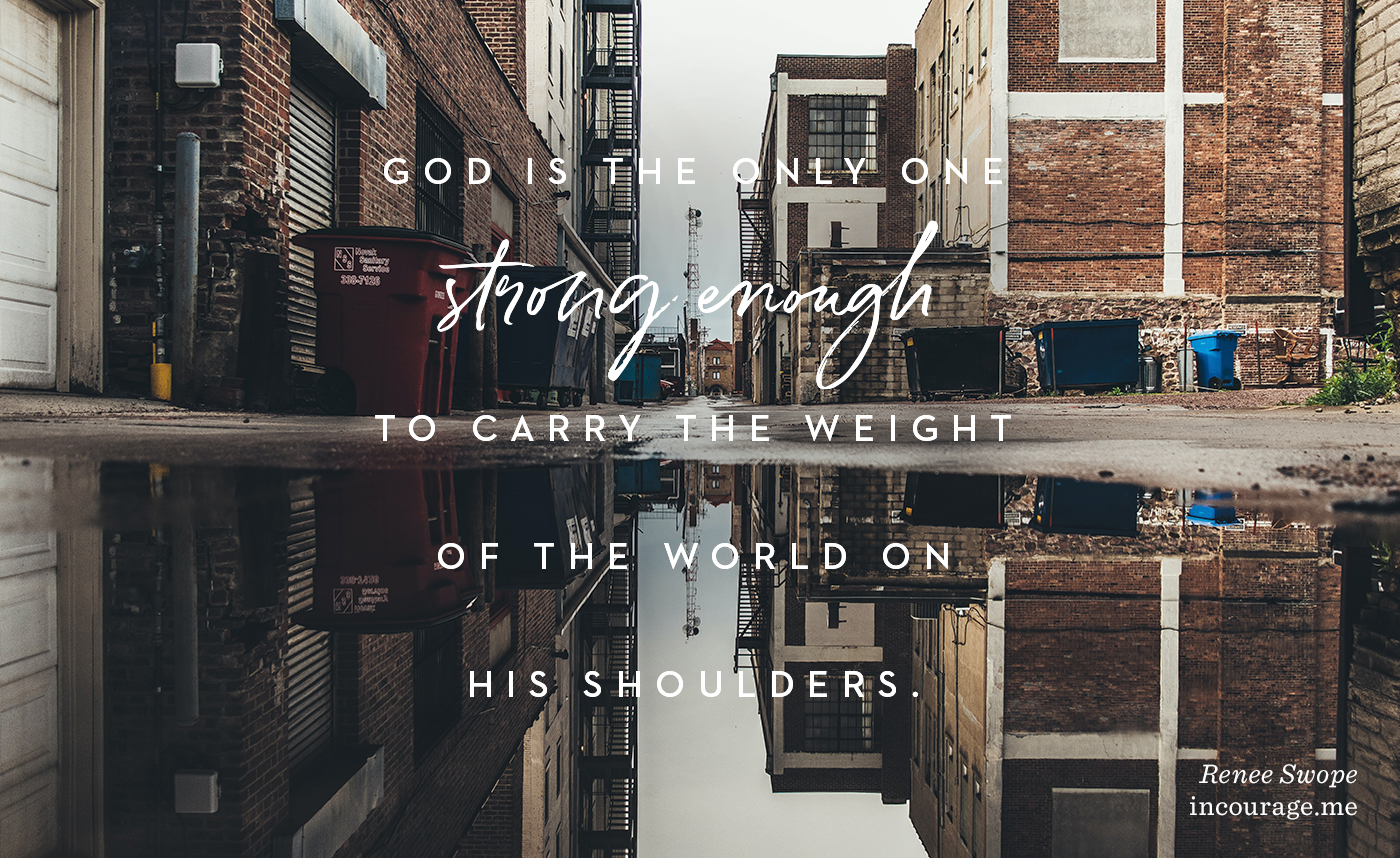 God is the only One strong enough to carry the weight of the world on His shoulders. He can handle it all, the sadness and fear, the sorrow and pain. He sees what we can’t, and He reminds us we don’t have to make it all okay.