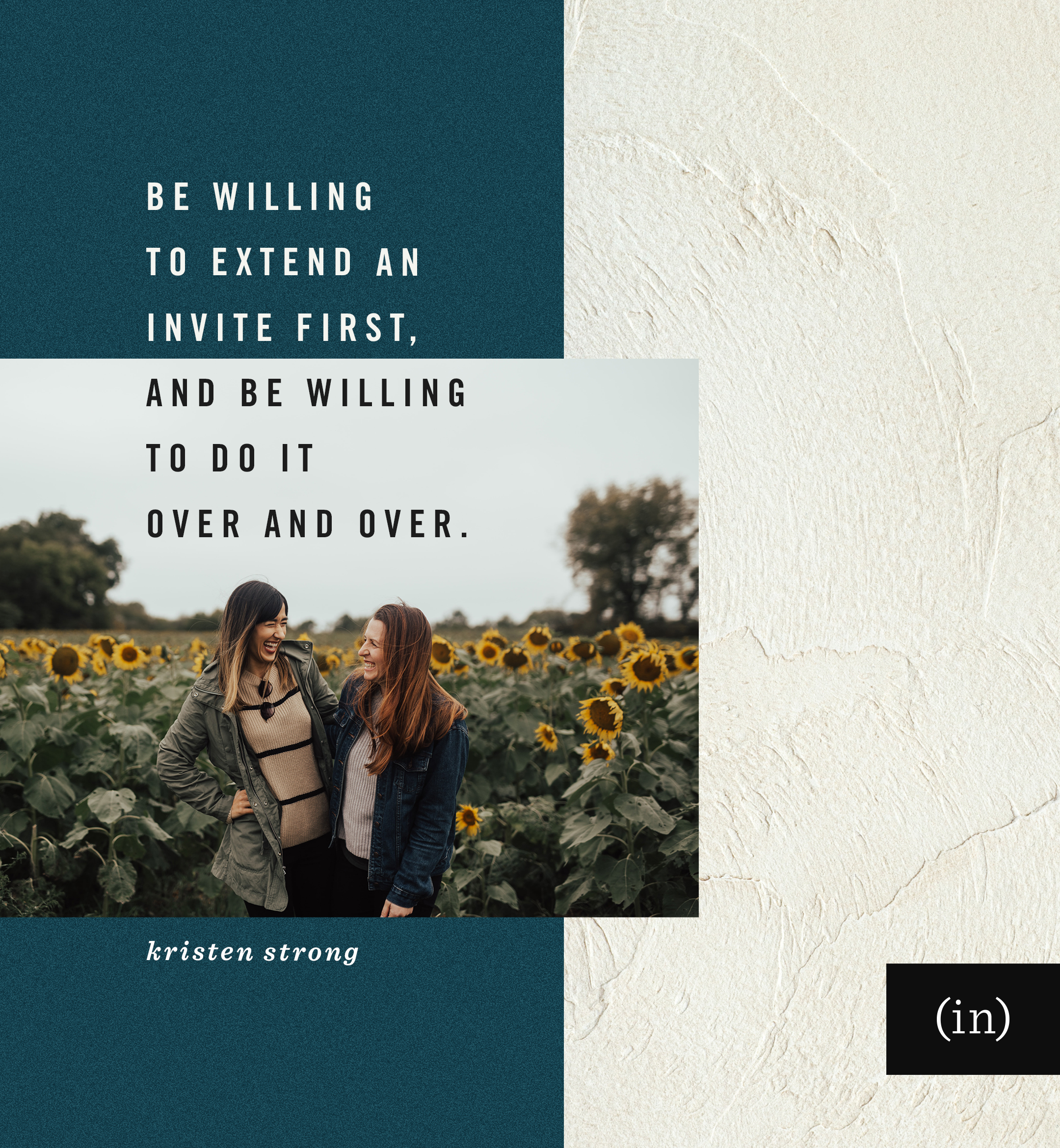 But in the places you do find yourself — church, the neighborhood, the book club — you can intentionally keep your eyes open for potential friends whom you can invite over for dinner, coffee, or just to chat on the front steps. Keep at it, and don’t wait for someone to invite you. Be willing to extend an invite first, and be willing to do it over and over.