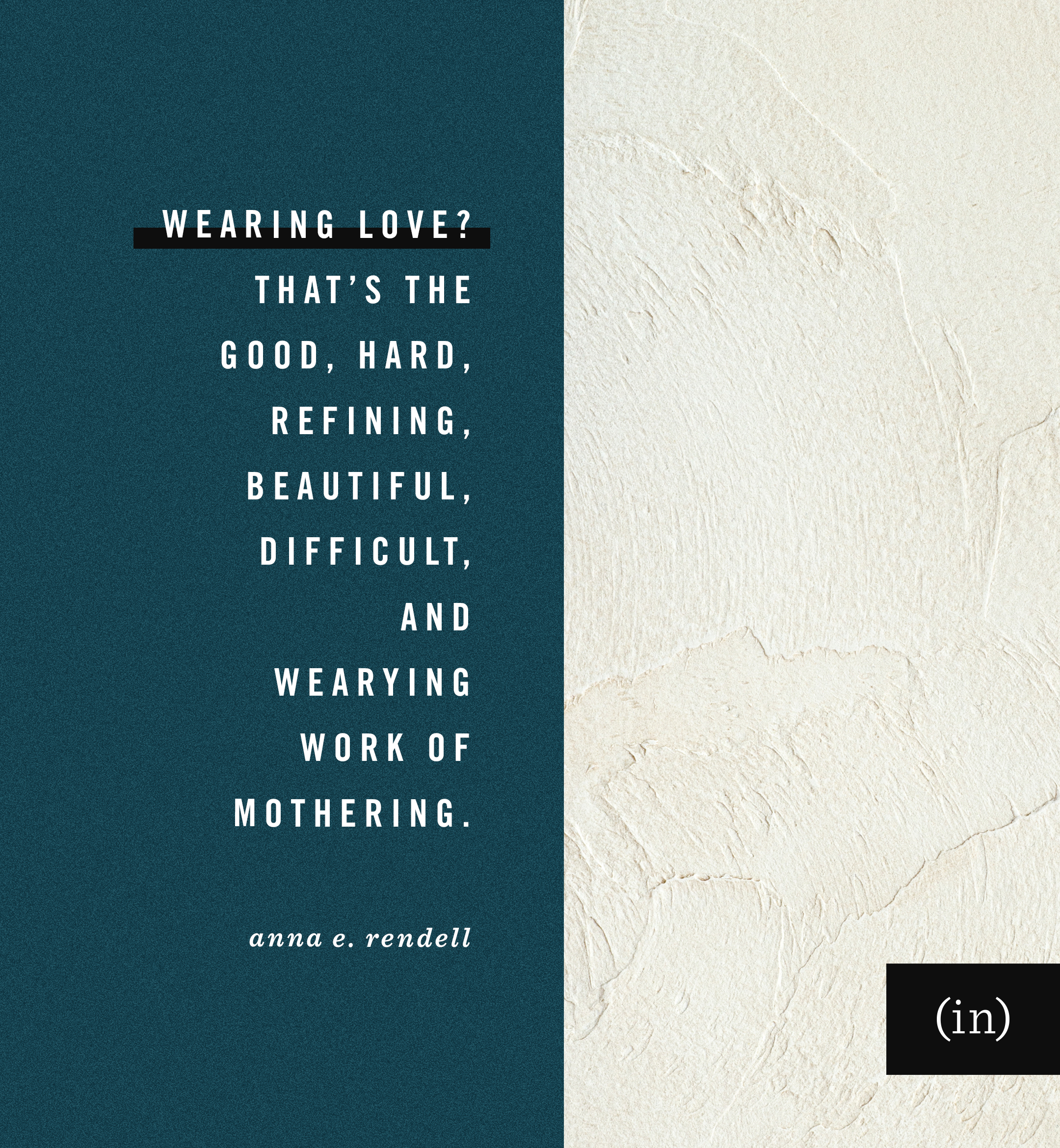 Wearing love? That’s the good, hard, refining, beautiful, difficult, and wearying work of mothering. It’s easier to choose love when the kids are tiny and adorable, when timeouts and suckers fix most problems. But often, there’s nothing easy about choosing to love. Choosing to live out love in our actions, thoughts, and words can be a difficult garment to wear. During the fourteenth round of hide-and-seek. When you’ve asked them seven times to put their shoes on. When it’s just past midnight and they walk in the door late for curfew. When they tell you that they have a Greek-to-English alphabet poster due . . . tomorrow. When the principal calls — again. When you’re just not connecting with your teen. When your grown kids are raising their own kids but not the way you’d do it.