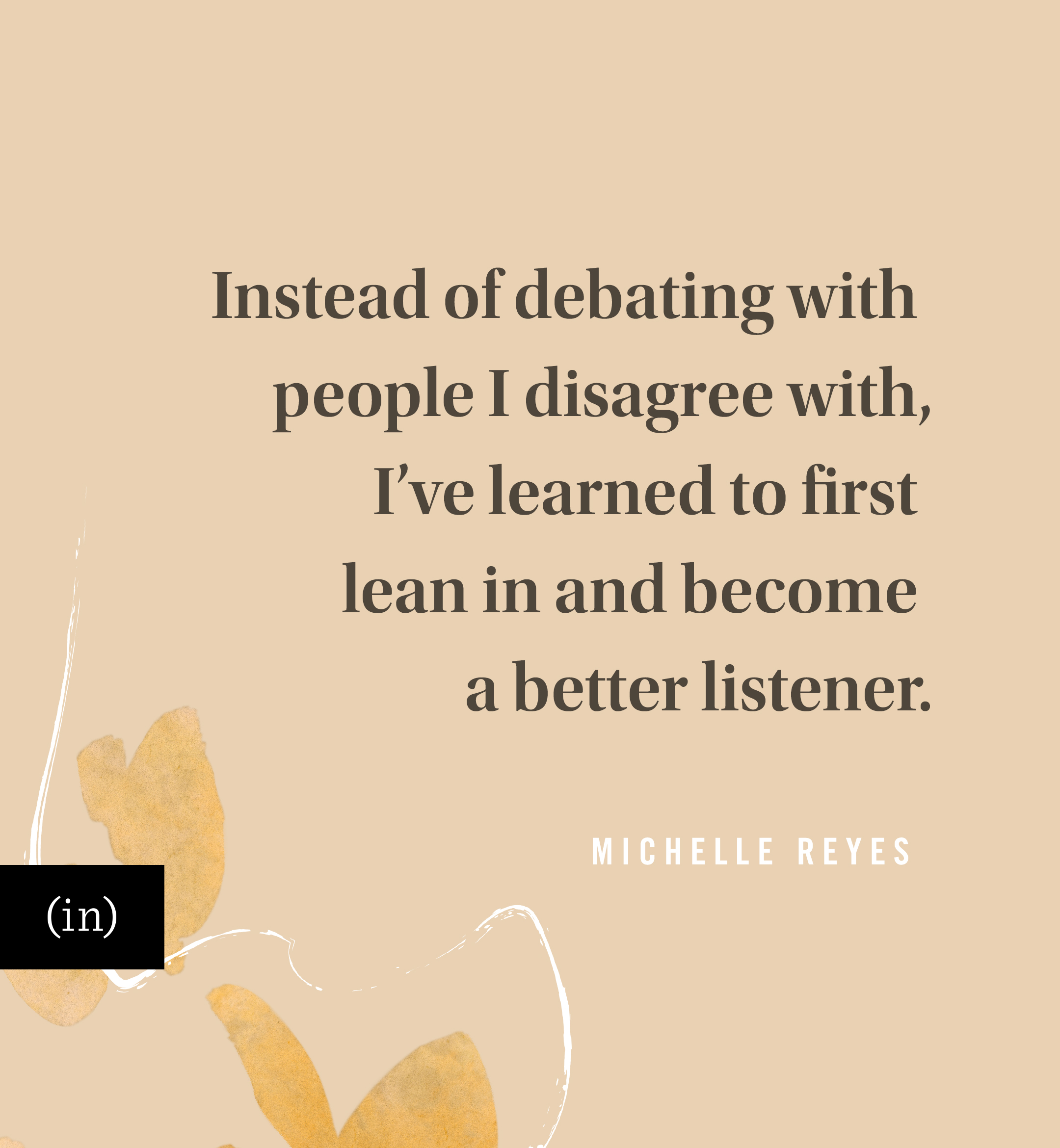 Nowadays, when I ask questions like this, instead of powering forward with a defense, I find that I’m able to connect with people on deeper levels and, ultimately, show the love of Christ to others. In choosing to connect instead of correct, I find that God opens doors for new perspectives and unexpected friendships. I won’t always agree with the people in my life, be that my family, friends, or neighbors, but I know that I can lean in with love and a desire to learn and understand, and that will have a far greater impact than choosing to debate.