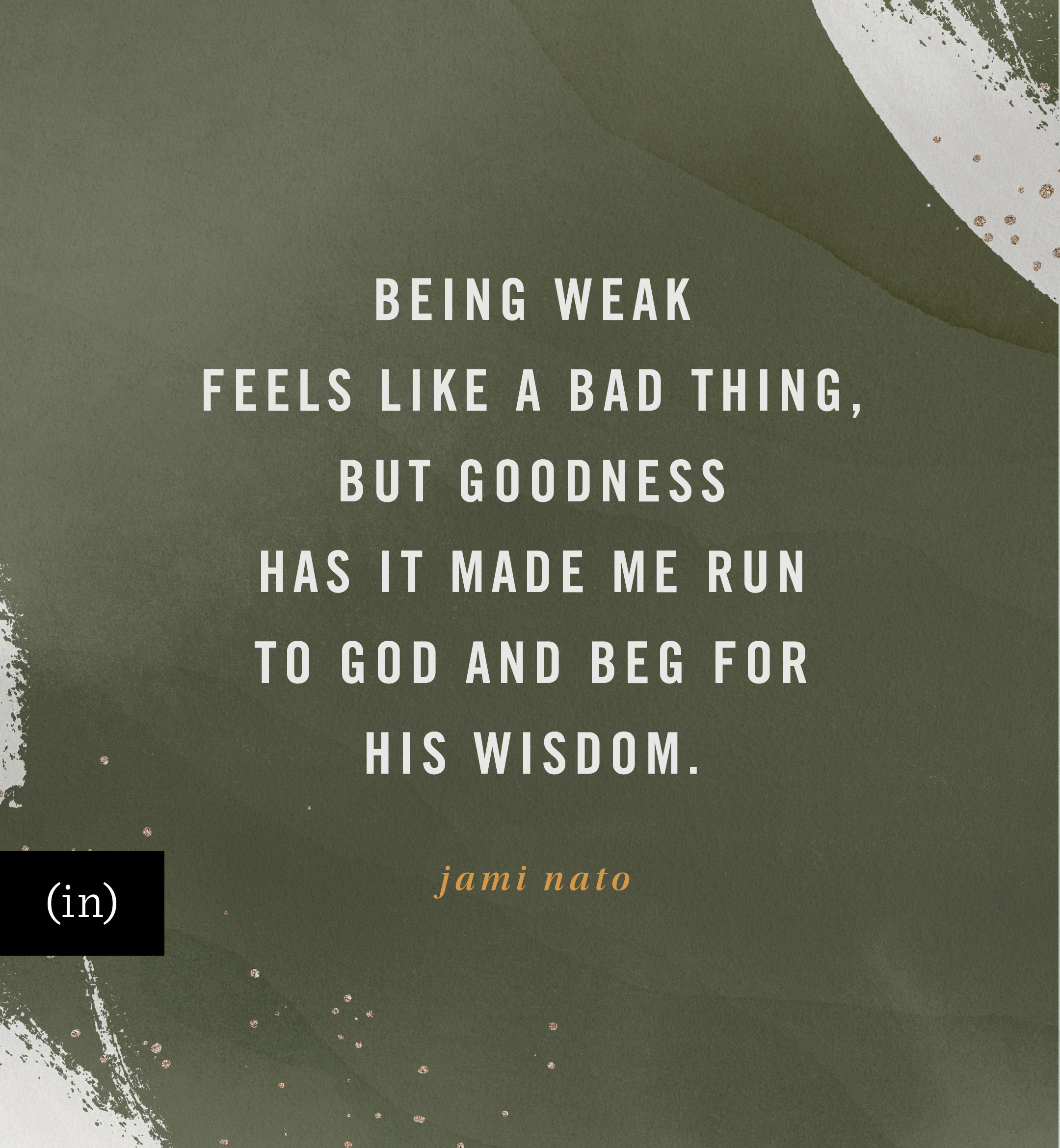 The title grabbed at me. “Being weak feels like a bad thing, but goodness has made me run to God & beg for His wisdom.” I thought of this line from “All in All”: “You are my strength when I am weak”. God alone is our strength. God understands our feeling & frustrations. He wants us to be obedient servants. Run to Him for help & guidance with all of life’s problems.