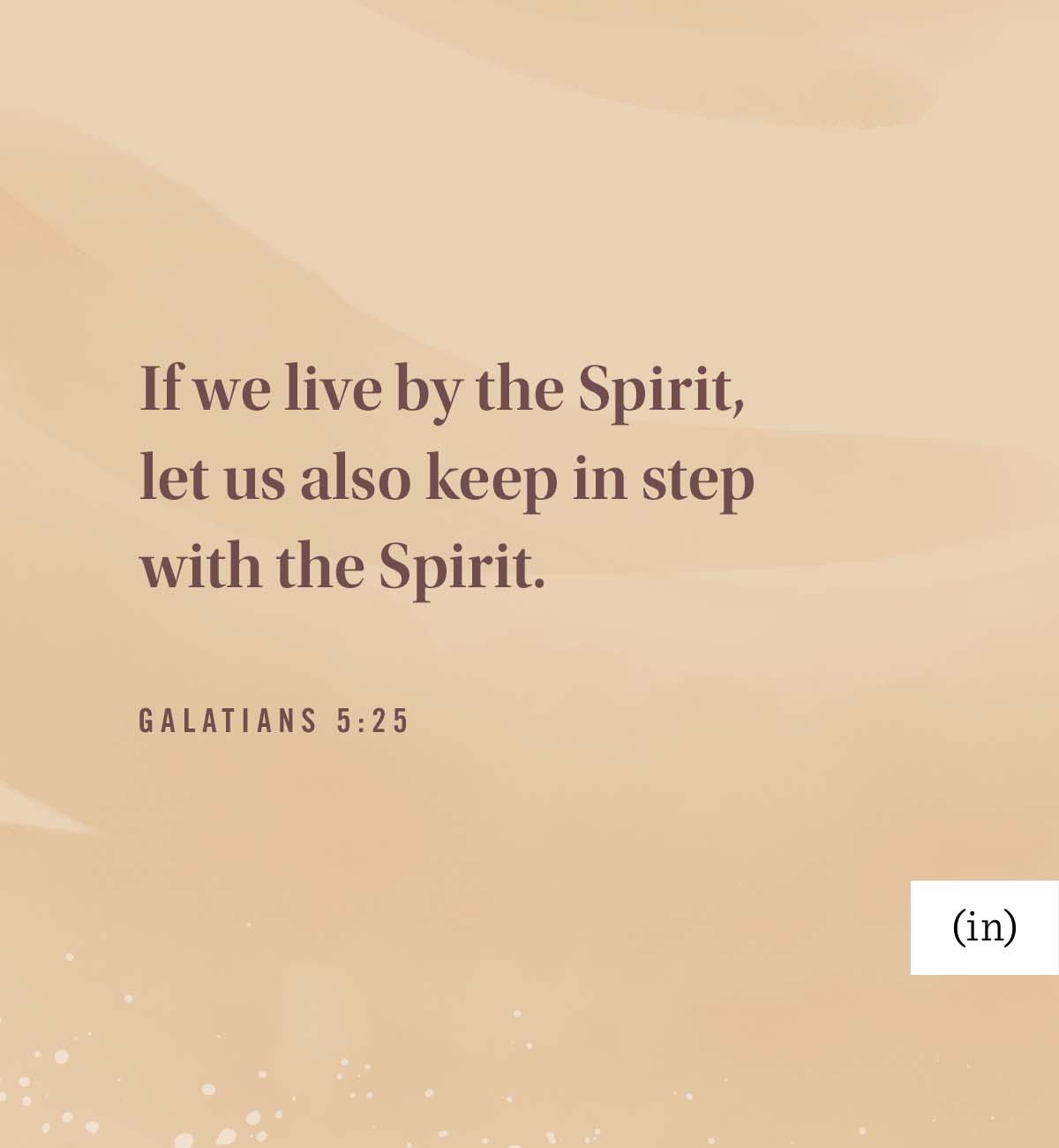 Following his famous list of spiritual fruit in Galatians 5:22–23, Paul gives this encouragement: “If we live by the Spirit, let us also keep in step with the Spirit” (v. 25 NIV). When we stay mindful of and surrendered to the Holy Spirit, peace will be the result. We don’t have to strive for it. We don’t have to make finding fruit of the Spirit another item on our to- do list. We just get to walk in step with Him. That is, we get to let God’s Word and Spirit guide us moment by moment, day by day, one step at a time.