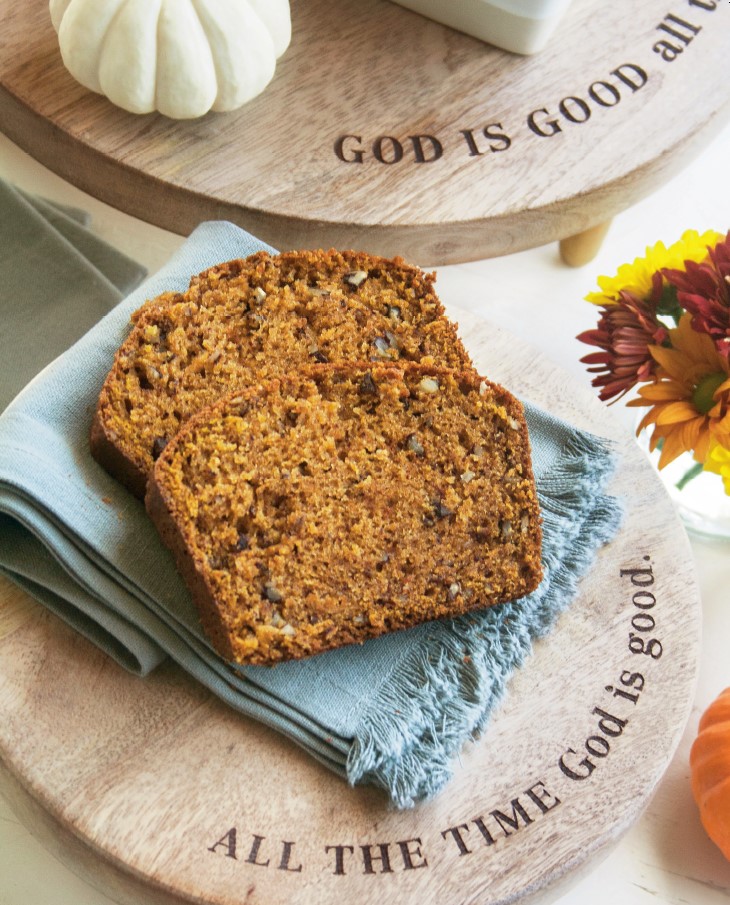 As you enjoy this harvest season, maybe you’ll have some time to make Pumpkin-Pecan Bread. The fall season just isn’t the same without it! Think about the abundant ways God has blessed you this season as you mix the pumpkin puree, cinnamon, and other good things into the batter. And thank Him in advance for how He is working to fill the needs you are praying about right now. You can rest in His promise in Philippians 4:19 that He will provide all you need.